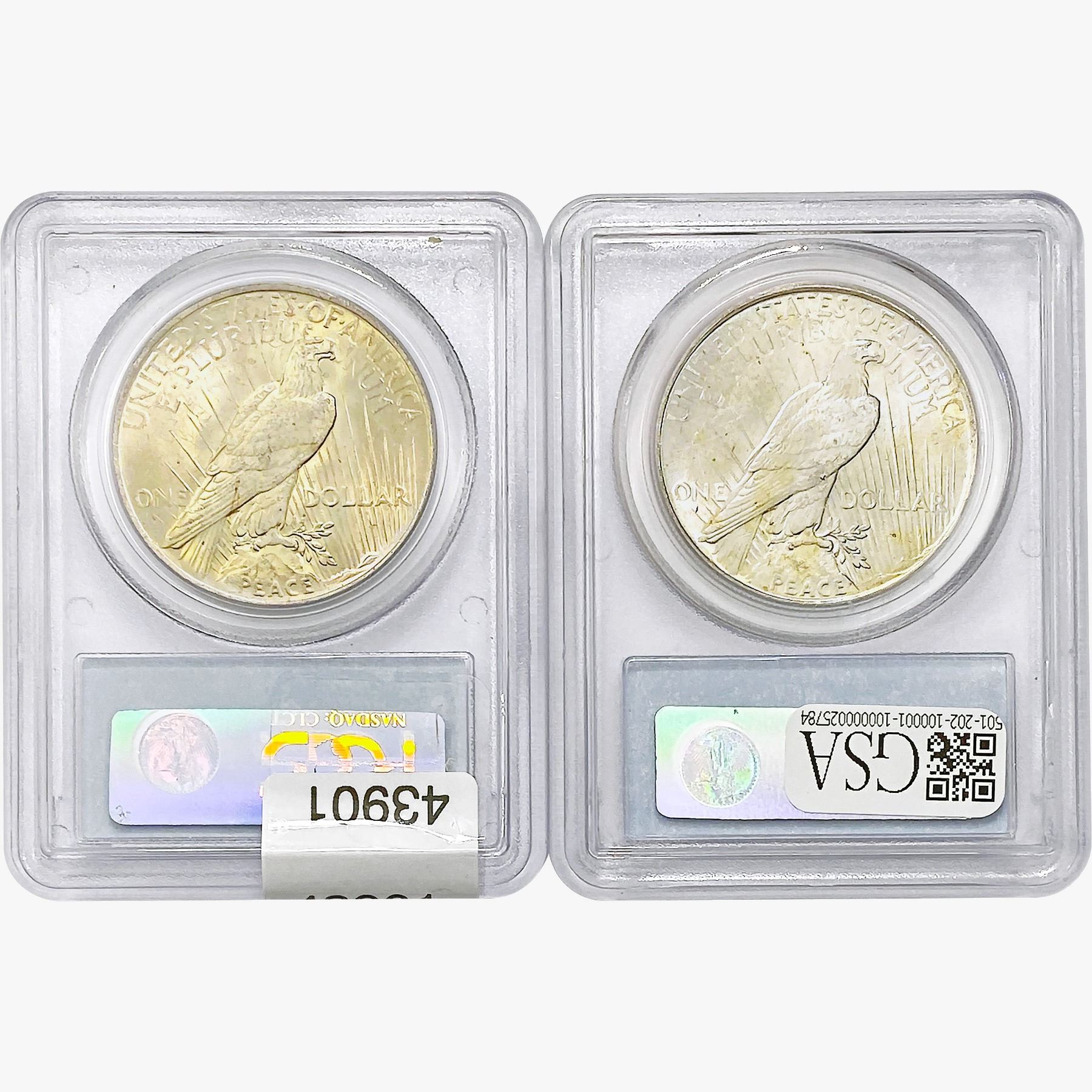 COINS AND CURRENCY LISTED IN GSA’S CATALOG AS GRADED AND ENCAPSULATED BY PCGS, NGC, ANACS, ICG, PCGS CURRENCY, PMG, PCGS BANKNOTE GRADING, CMC OR ANY OTHER THIRD-PARTY GRADING SERVICE ARE LIKEWISE SOLD “AS-IS” EXCEPT AS EXPRESSLY SET FORTH HEREIN. ALL THIRD-PARTY GRADING SERVICE GUARANTEES, INCLUDING AUTHENTICITY, ARE THE SOLE RESPONSIBILITY OF THE THIRD-PARTY GRADING SERVICE AND NOT WARRANTIES OR GUARANTEES OF GSA. BIDDERS SHOULD CONTACT THESE THIRD-PARTY GRADING SERVICES DIRECTLY WITH RESPECT TO ANY CLAIMS OR QUESTIONS THEY MAY HAVE CONCERNING THEIR GUARANTEES AND WARRANTIES. BIDDERS ACKNOWLEDGE AND AGREE THAT AUCTIONEER IS NOT BOUND BY OR LIABLE FOR ANY OPINION OR CERTIFICATION BY ANY THIRD-PARTY GRADING SERVICE. REMOVAL OF A PRODUCT FROM ITS PROTECTIVE CASING OR HOLDER OR ALTERATION OF ANY COIN HOLDER WAIVES ALL RIGHTS CONCERNING THE PRODUCT CONTAINED THEREIN.