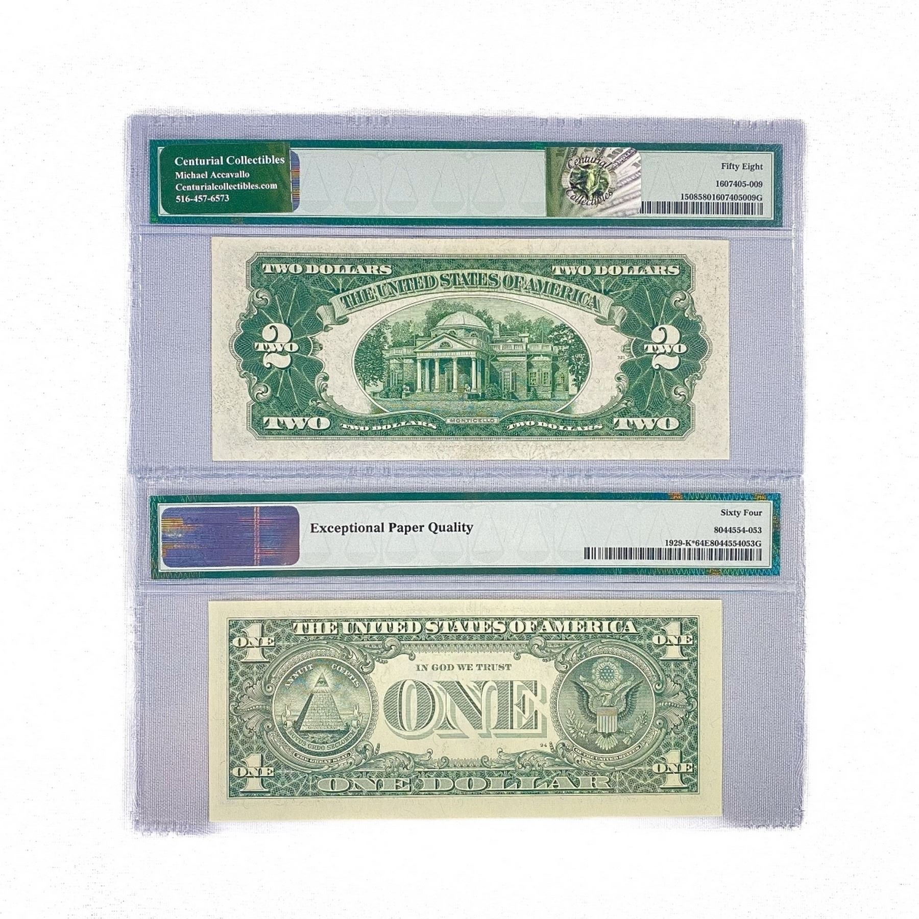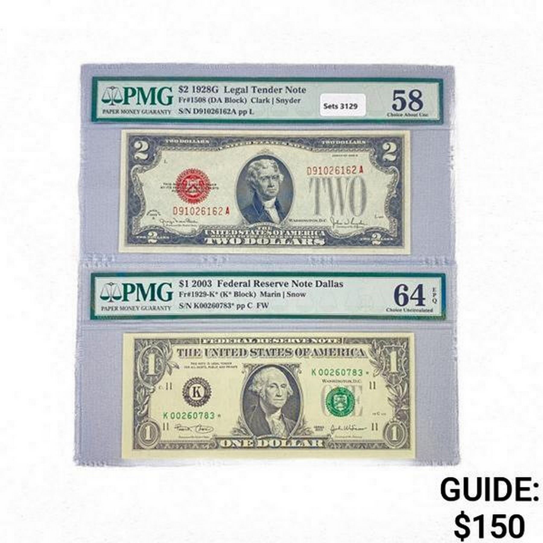 (2) 1928 & 2003 $2 & $1 Fed Reserve Notes PMG