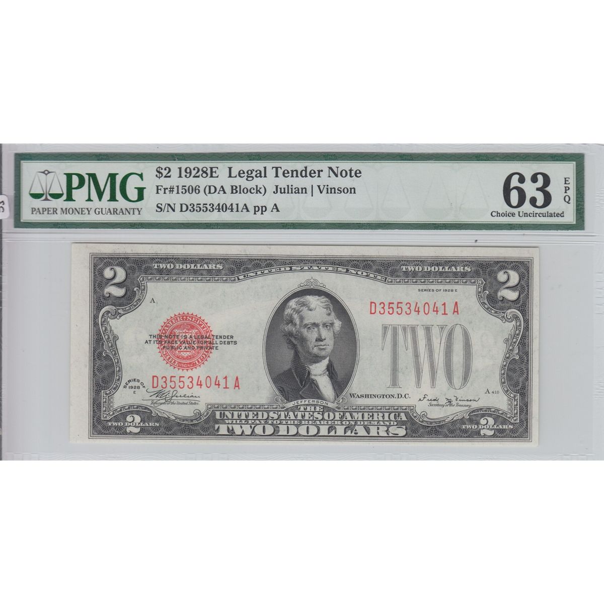 $2 1928 E RED SEAL PMG UNC 63 EPQ