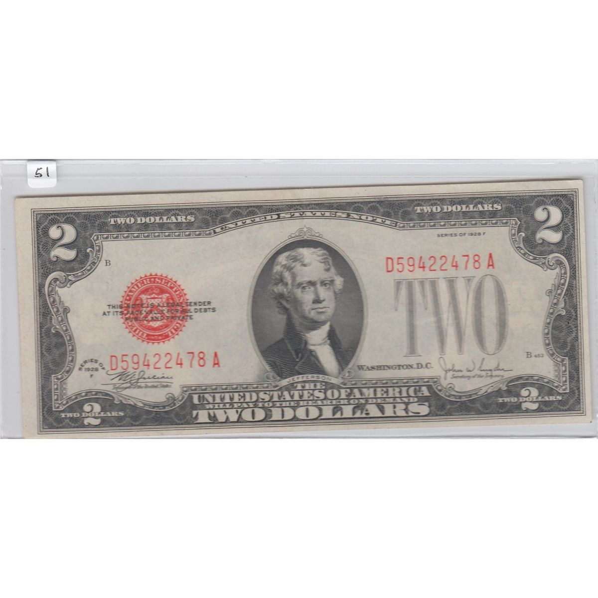 $2 1928 F RED SEAL BOLD SHARP NOTE AU+