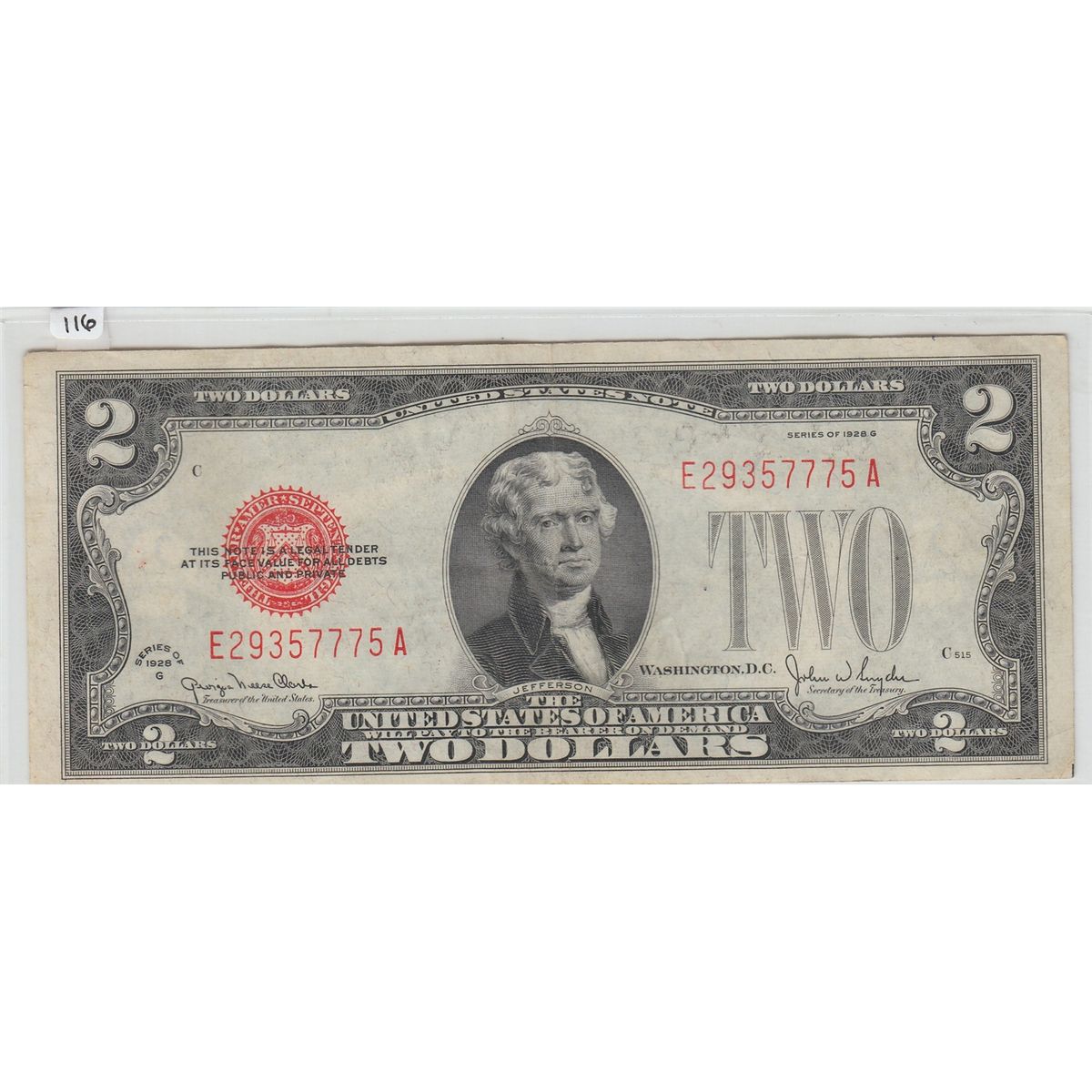 $2 1928 G RED SEAL LEGAL TENDER
