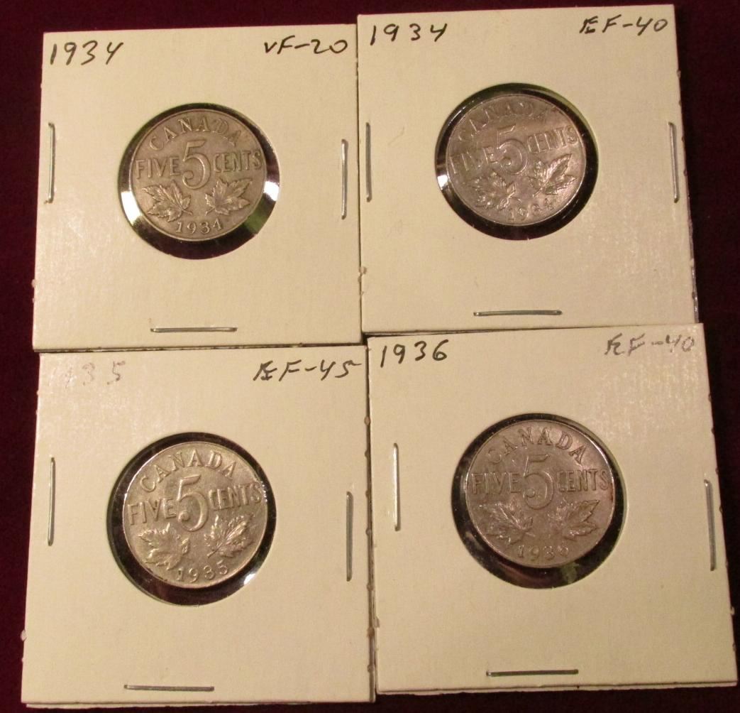 (2) 1934, 35 & 36 Canada Nickels. VF-EF. Catalog Value $80.00.