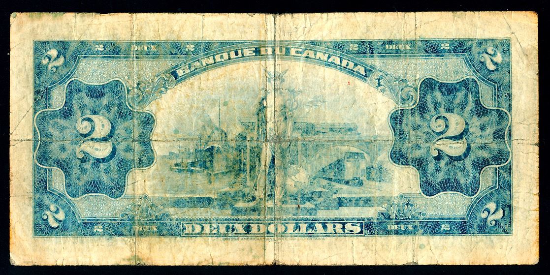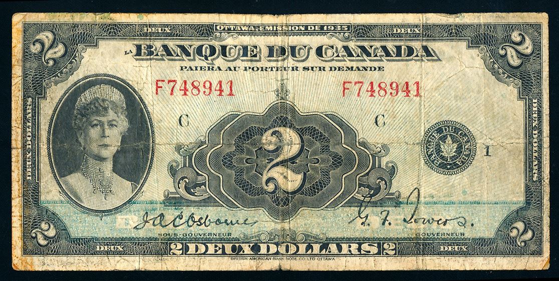 Bank of Canada, Two Dollars, 1935, French Text, BC-4, series C, VG. S/N : F748941, Osborne/Towers. Catalogue $250 cnd
