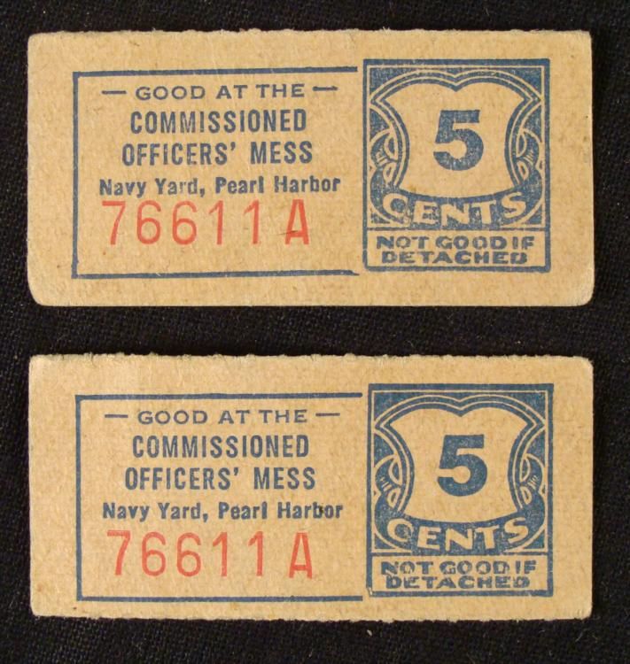 2 1940s WWII Pearl Harbor Officers Mess 5 Cents Coupons