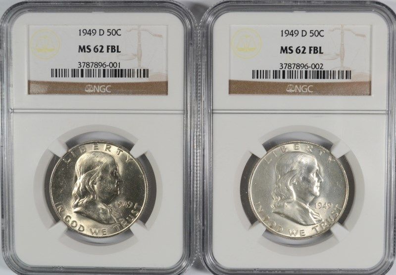 ( 2 ) 1949-D FRANKLIN HALF DOLLARS, NGC MS-62 FBL