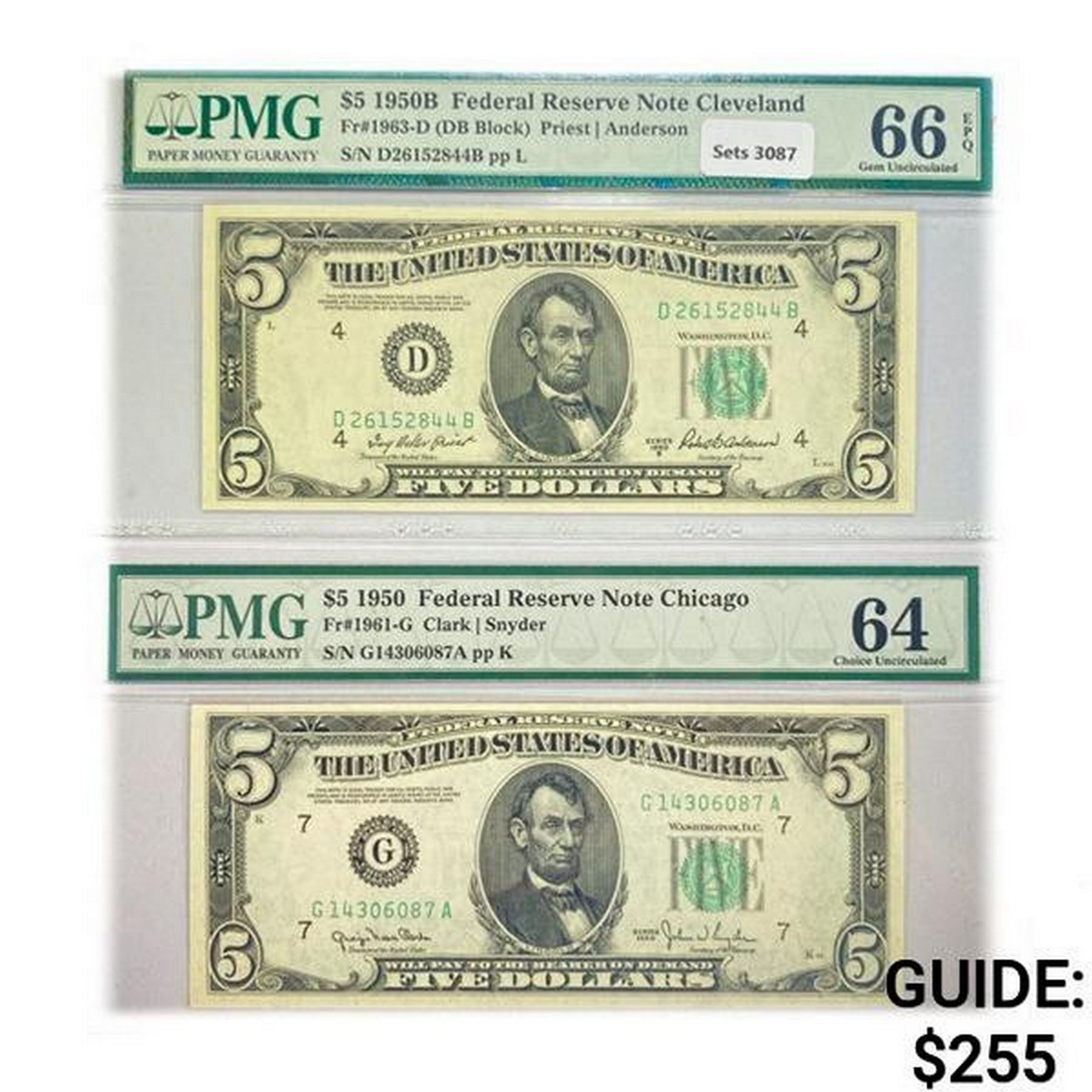 (2) 1950 $5 Fed Reserve Notes PMG