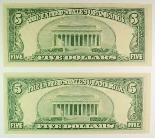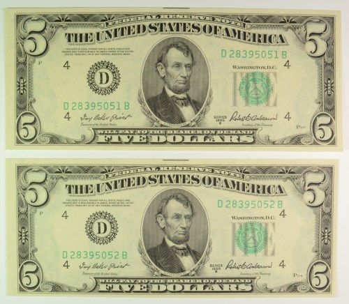 ( 2 ) 1950-B $5.00 FRN, GEM UNC CONSECUTIVE SERIAL NUMBERS