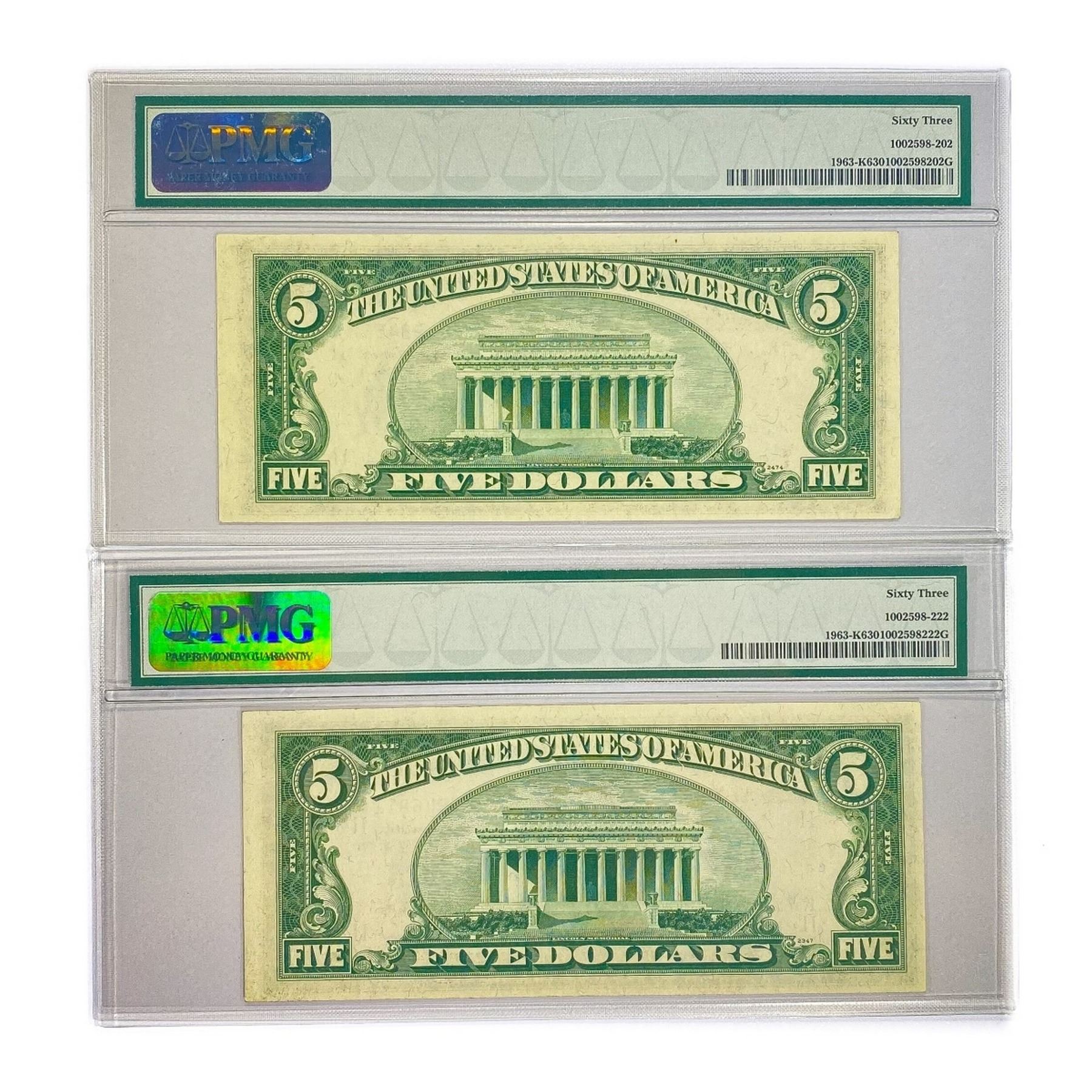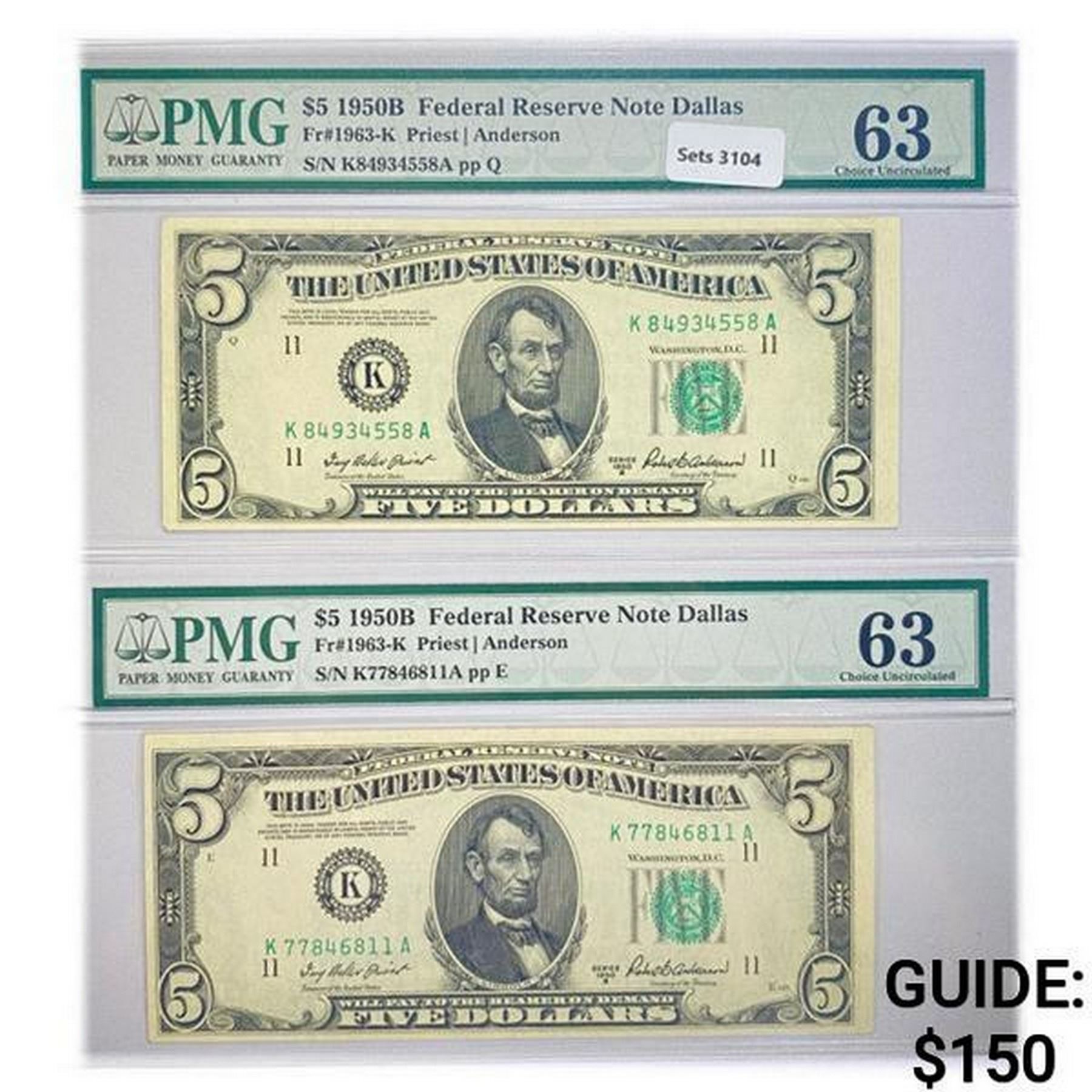 (2) 1950 B $5 Fed Reserve Notes PMG Ch UNC 63