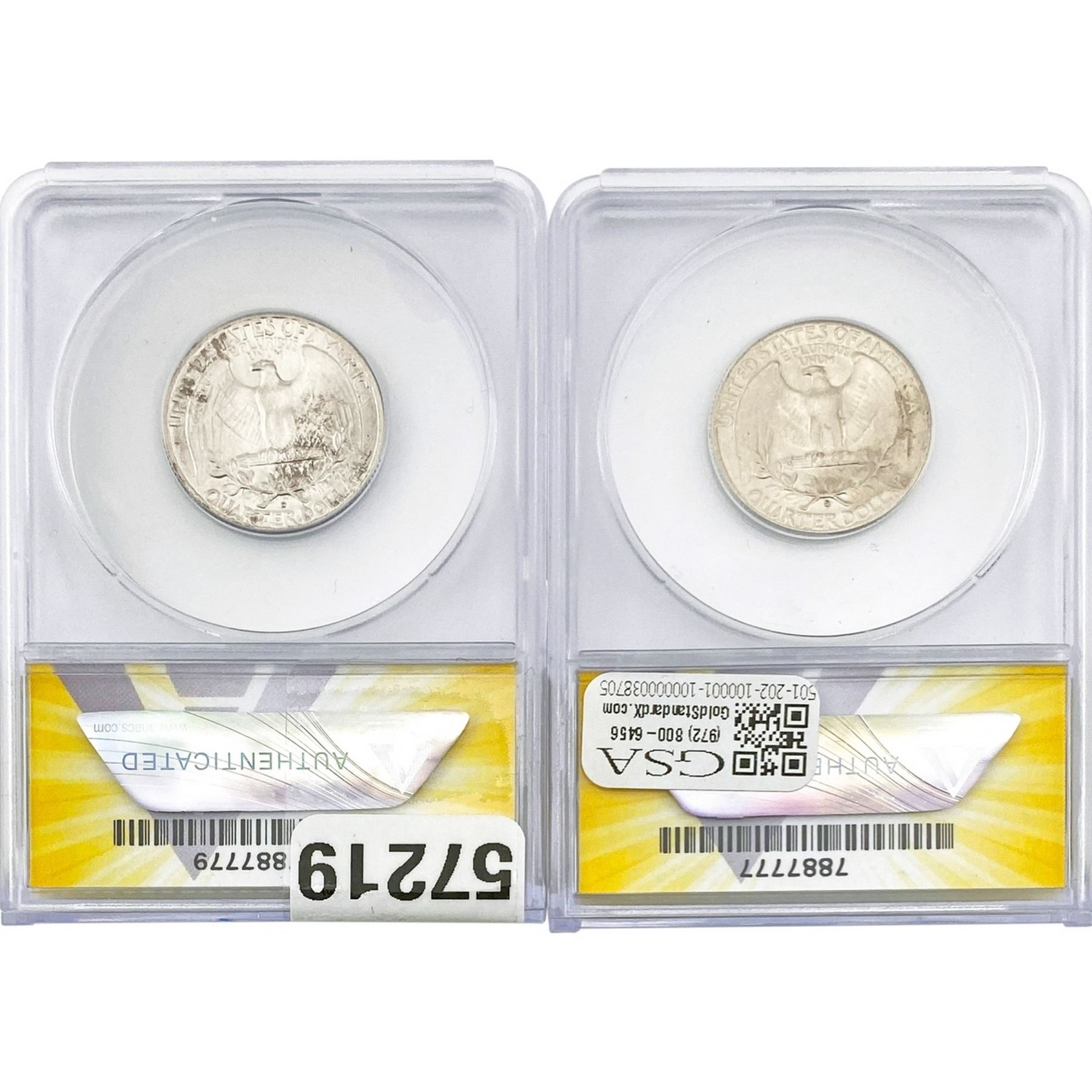 e. Coins sold referencing a third-party grading service are sold “AS IS” without any express or implied warranty, except for a guarantee by GSA that they are genuine. Removal or alteration of the holder, voids all of Bidder’s claims concerning that Product. Certain warranties may be available from the grading services and Bidders are referred to them for further details: Numismatic Guaranty Corporation (NGC), PO Box 4776, Sarasota, FL 34230, www.ngccoin.com/services/writtenguarantee.asp; Professional Coin Grading Services (PCGS), PO Box 9458, Newport Beach, CA 92658, www.pcgs.com/guarantee.html; ANACS, 6555 S. Kenton St., Ste. 303, Englewood, CO 80111; and Independent Coin Grading Co. (ICG), 7901 East Bellview, Ave., Suite 50, Englewood, CO 80111.
