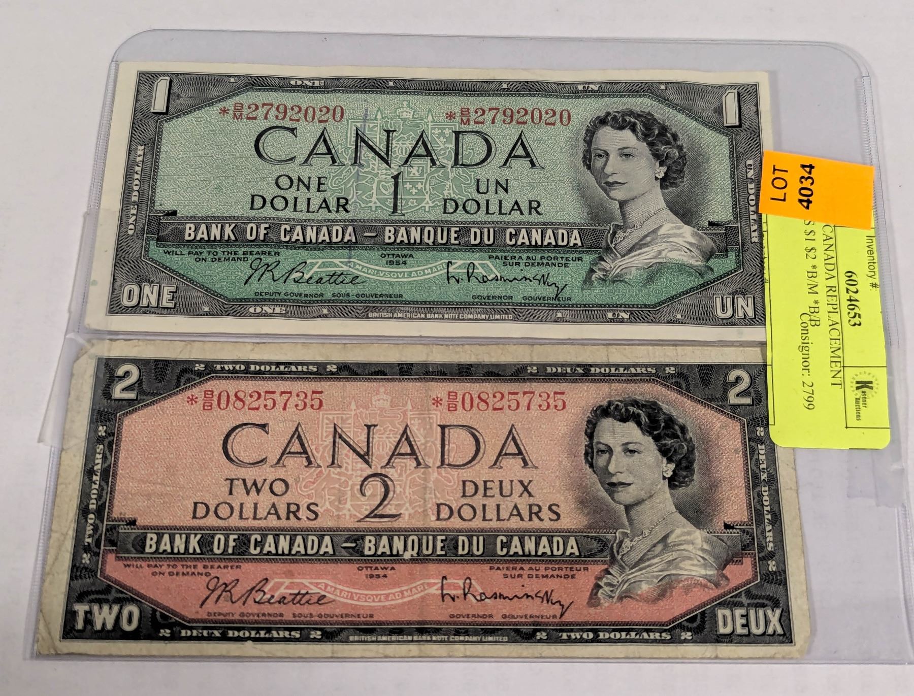 2 1954 CANADA REPLACEMENT NOTES $1 $2 *B/M *B/B