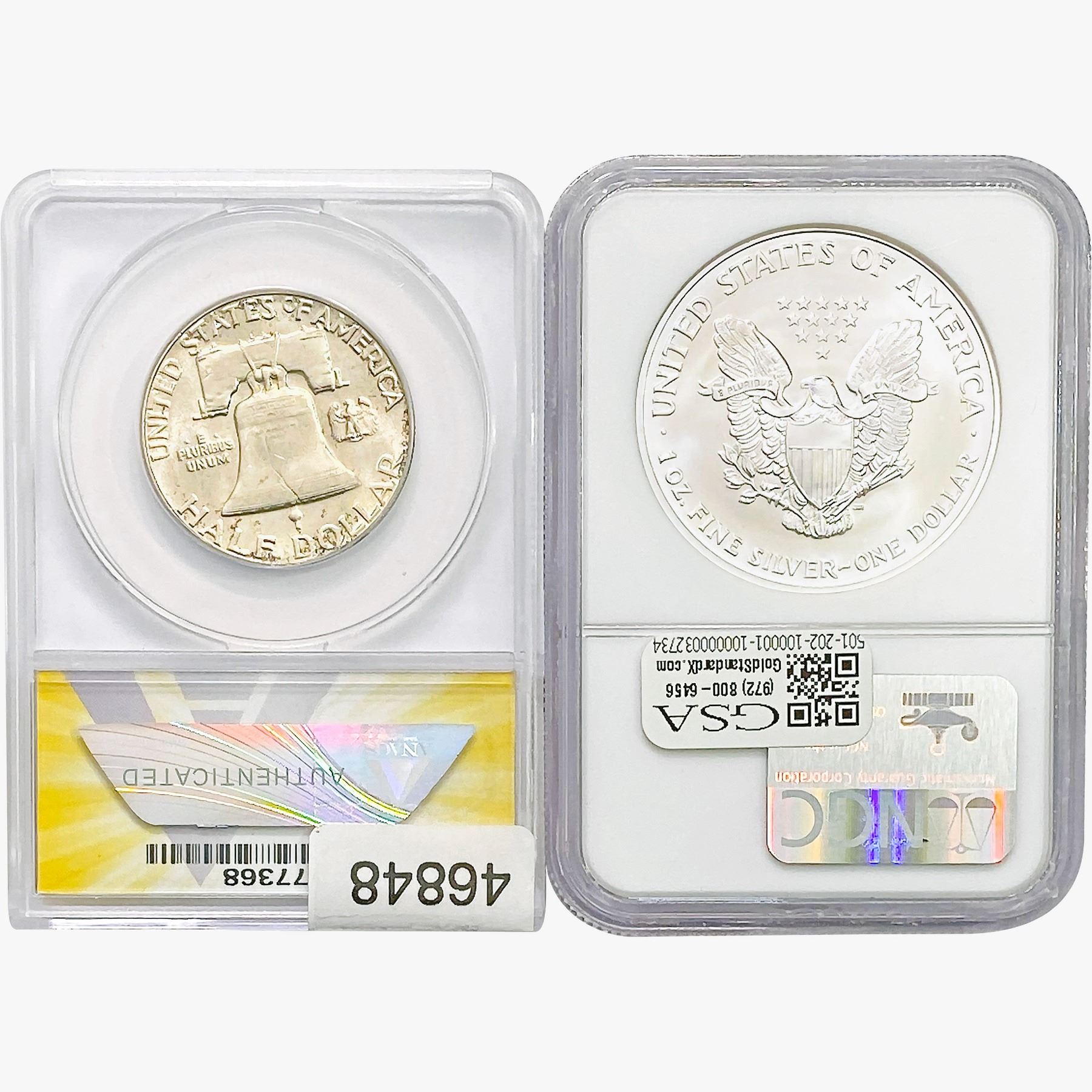 [2] 1955&2003 50C Franklin Coin, $1 Silver Eagle Coin MS63/69