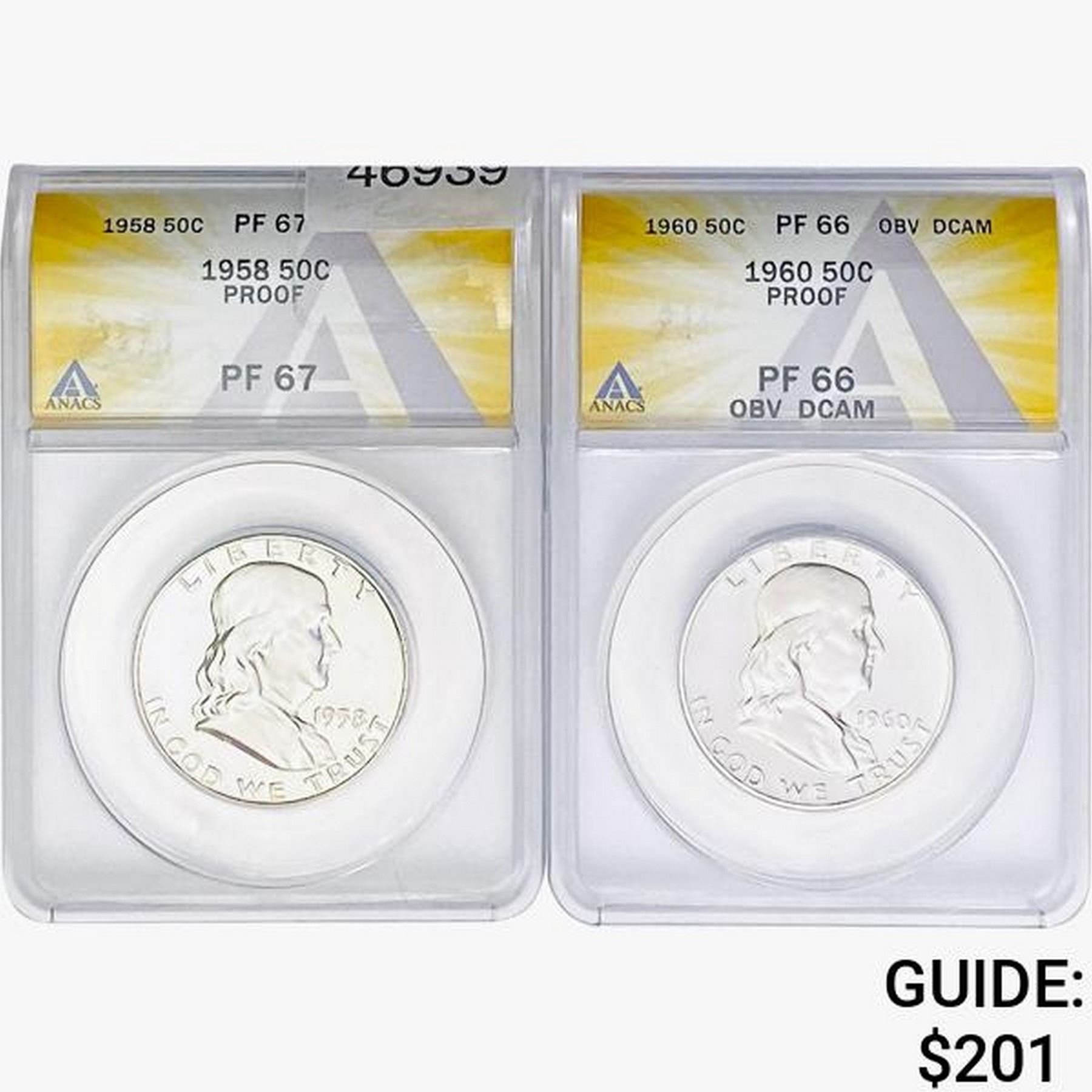 [2] 1958&1960 Franklin Half Dollar ANACS PF66/67 PF, OBV DCAM