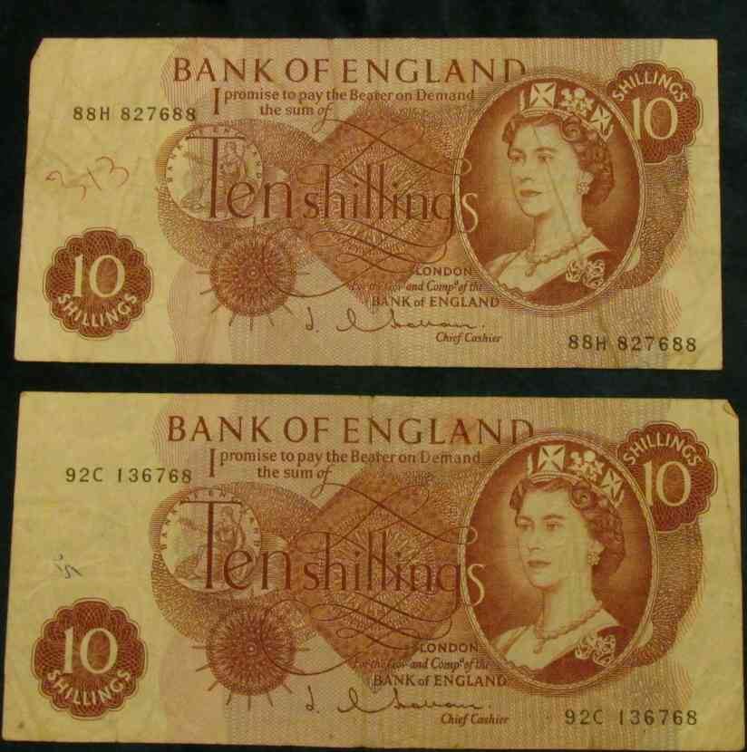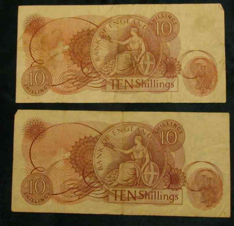 (2) (1960-70) Bank of England Ten Shilling Notes, F. Pick # 130.