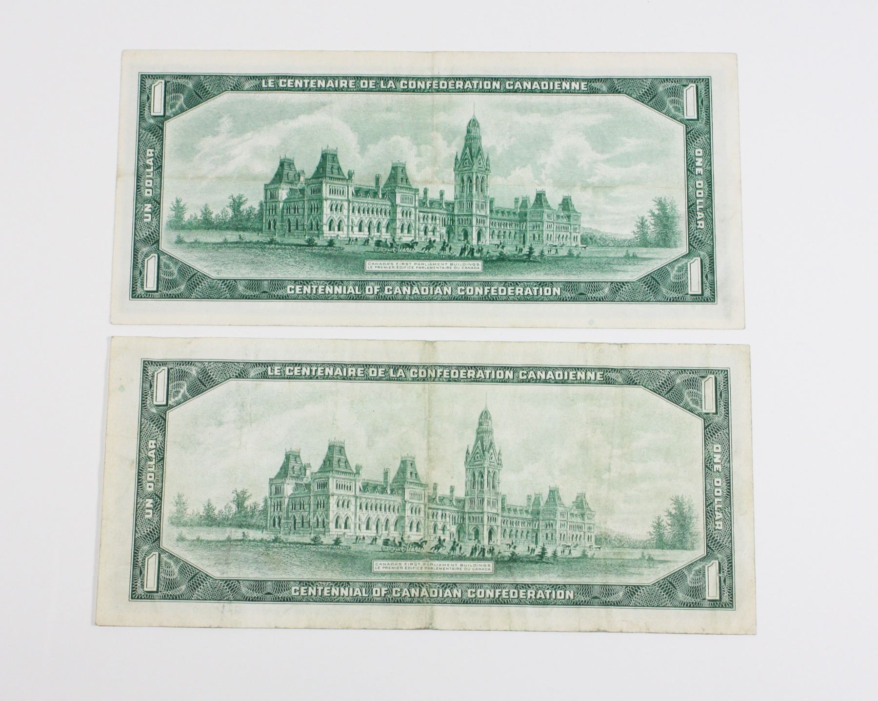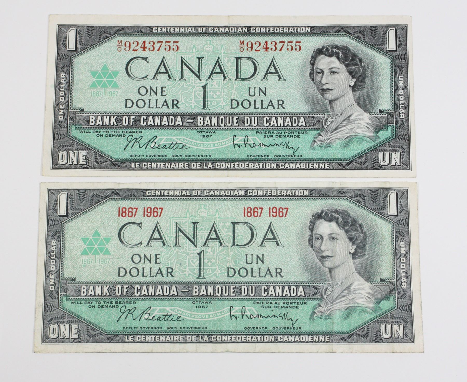 BEATTIE RAMINSKY BRIGHT CRISP PERFECT BILL UNC-62. TWO 1867-1967 $1.00 bills one with no serial #s and one with Serial Numbers One of the very best quality and colorful bills High Quality