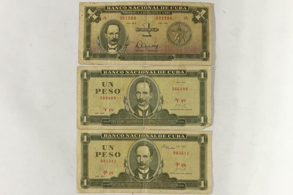 2-1972 & 1975 CUBA 1 PESO NOTES, 3 BILLS TOTAL