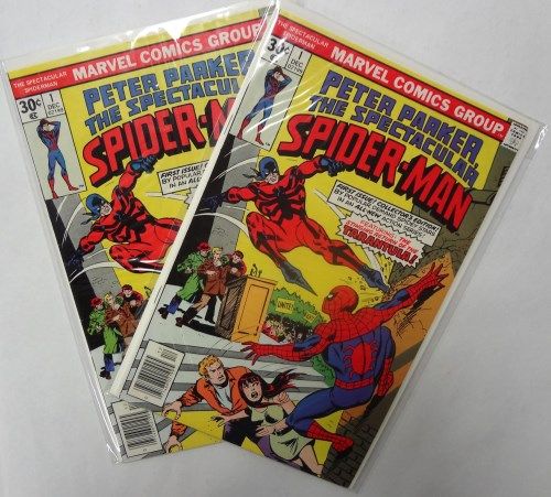 Receive TWO- #1 Spider-Man Comic books from 1976, both similar condition, minor wear upper right corner, Est $50-$70
