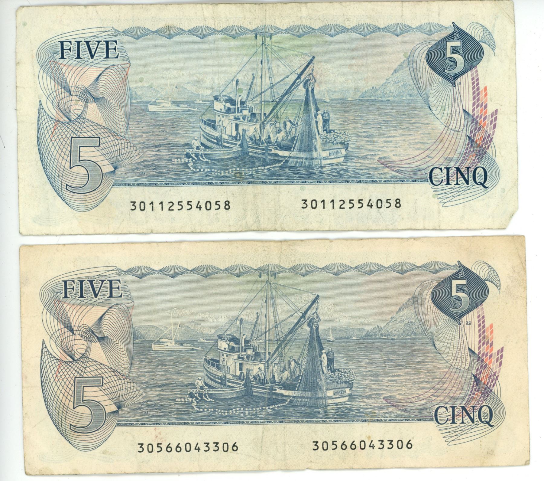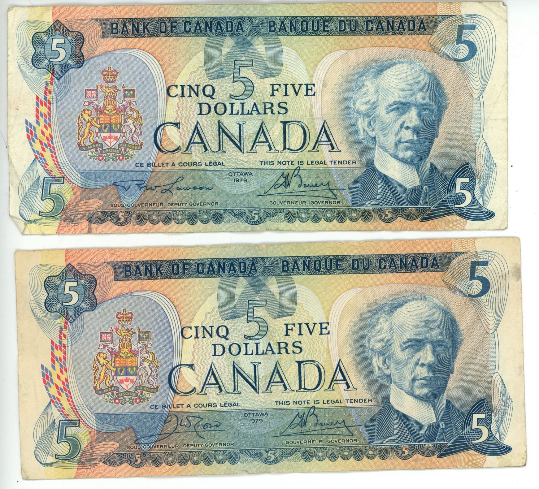 2 - 1979 Canadian 5 dollar bills - Lawson/Bouey - Assorted serial #'s