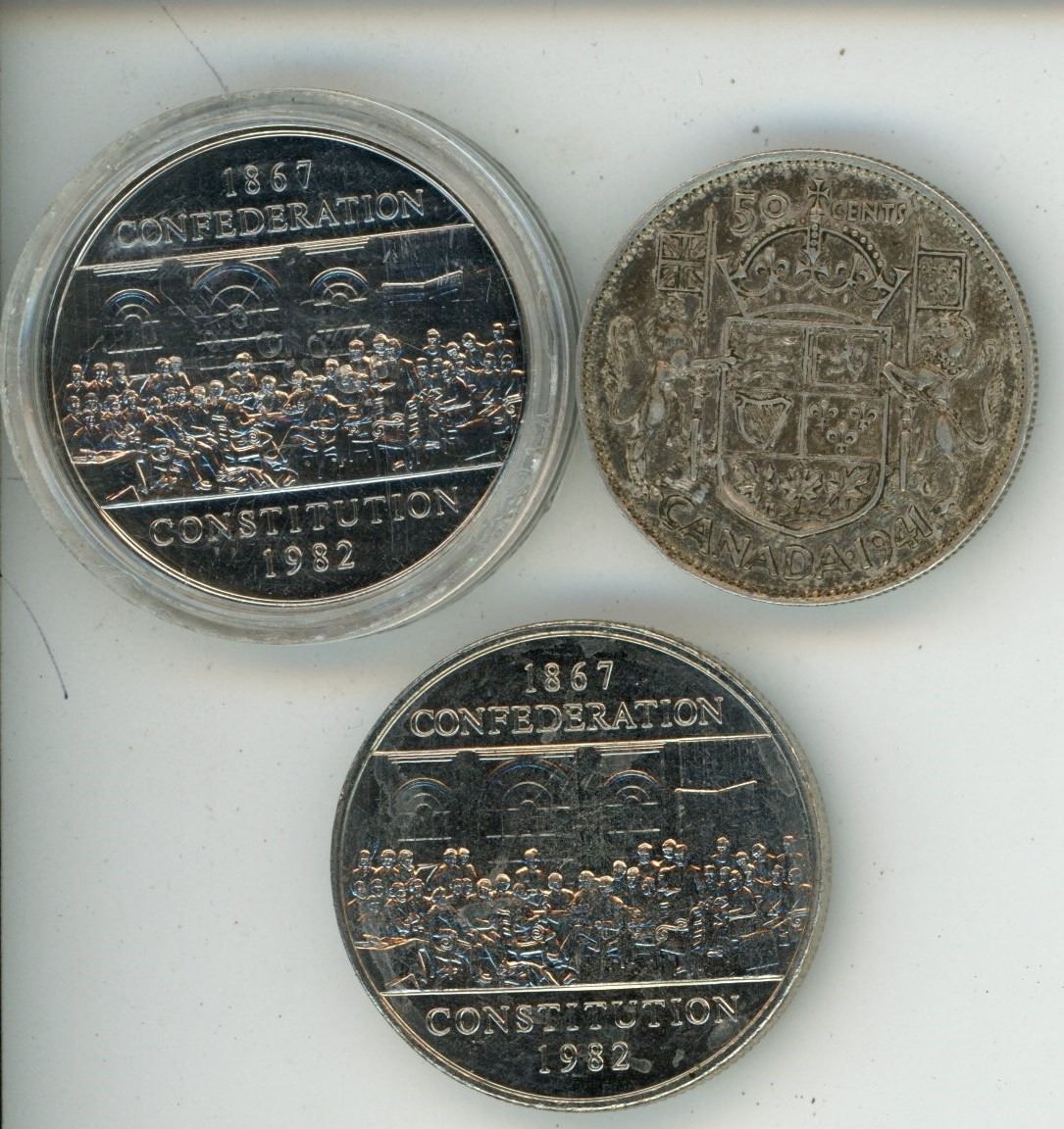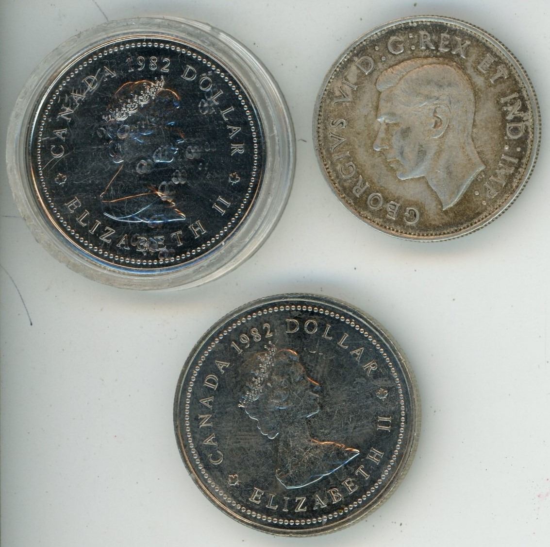 2 1982 Canadian Dollar Coins and 1 1942 Canadian 50 Cent Piece