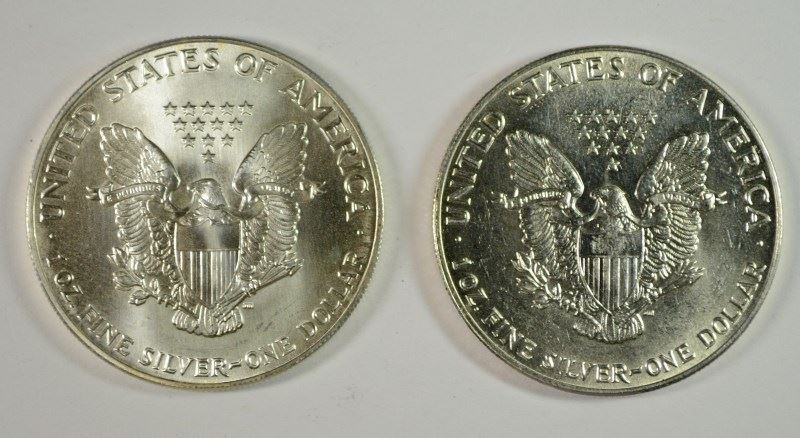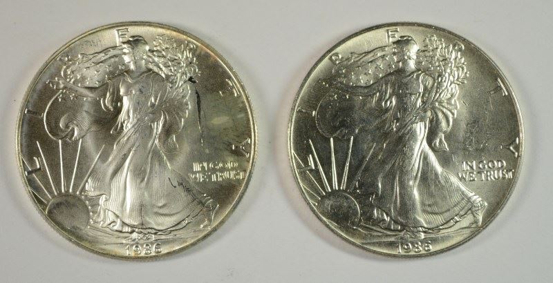 (2) 1986 AMERICAN SILVER EAGLES, UNC. COINS MAY HAVE SLIGHT SCRATCH/IMPERFECTION