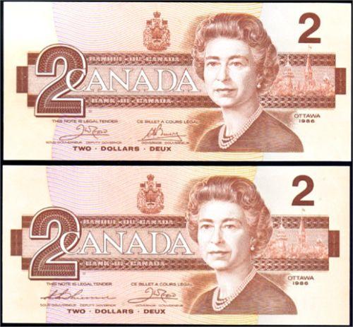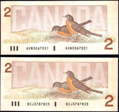 Bank of Canada Two Dollars 1986, Crow-Bouey, BC-55a Serial Number AUN3067021 and Two Dollars 1986, Thiessen-Crow, BC-55b One Large B and One Small B, Serial Number BGJ3787825. Two notes, both AU-Unc