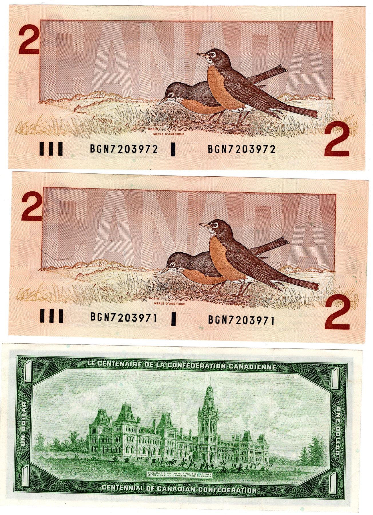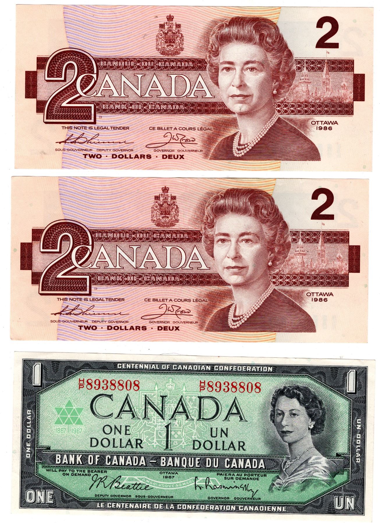 2 1986 DOLLAR BILLS AND, 1967 SERIAL NUMBER DOLLAR BILL