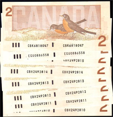 Bank of Canada Two Dollars 1986, Thiessen-Crow, BC-55b. Six consecutive notes CBH2492810 to 815. Plus Bonin-Thiessen, BABN, BC-55c CBK6818047 and Bonin-Thiessen, CBN, BC-55c-i EGU0886558. Total eight notes, all AU and Uncirculated, mostly Uncirculated