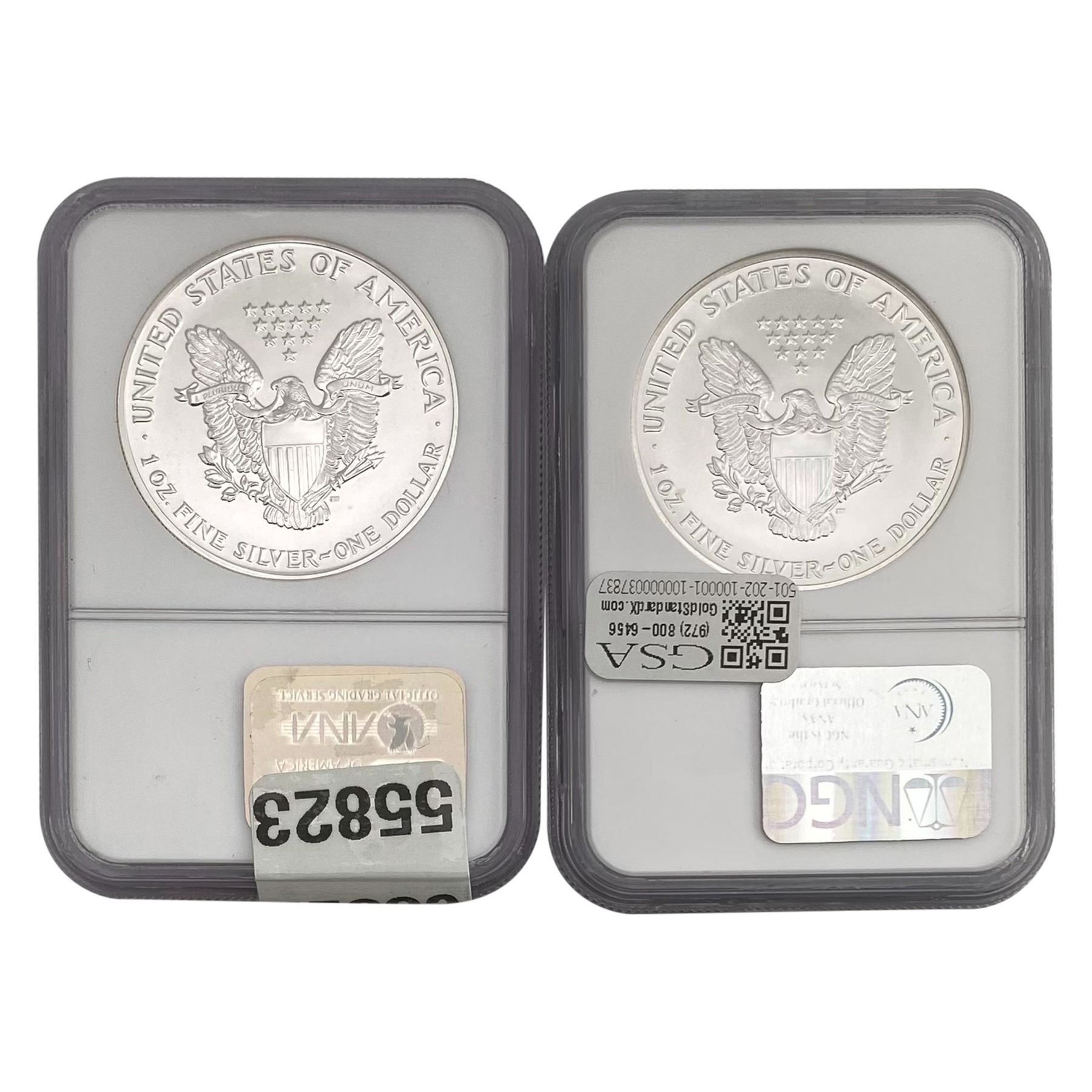 e. Coins sold referencing a third-party grading service are sold “AS IS” without any express or implied warranty, except for a guarantee by GSA that they are genuine. Removal or alteration of the holder, voids all of Bidder’s claims concerning that Product. Certain warranties may be available from the grading services and Bidders are referred to them for further details: Numismatic Guaranty Corporation (NGC), PO Box 4776, Sarasota, FL 34230, www.ngccoin.com/services/writtenguarantee.asp; Professional Coin Grading Services (PCGS), PO Box 9458, Newport Beach, CA 92658, www.pcgs.com/guarantee.html; ANACS, 6555 S. Kenton St., Ste. 303, Englewood, CO 80111; and Independent Coin Grading Co. (ICG), 7901 East Bellview, Ave., Suite 50, Englewood, CO 80111.