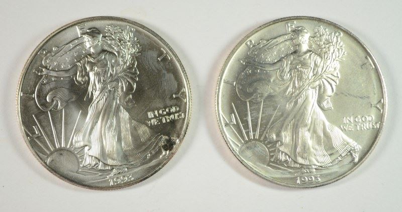 (2) 1993 AMERICAN SILVER EAGLES, UNC. COINS MAY HAVE SLIGHT SCRATCH/IMPERFECTION