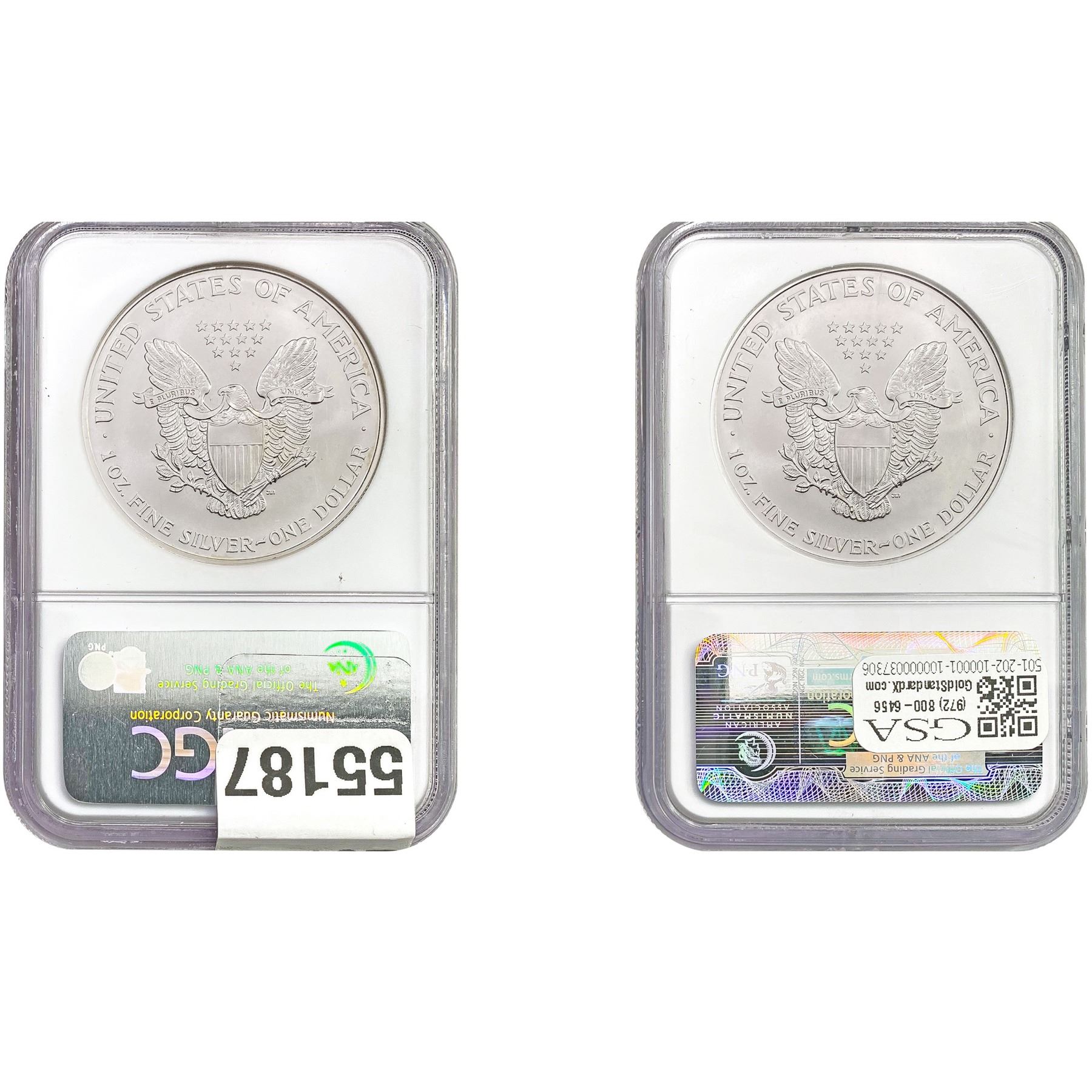 e. Coins sold referencing a third-party grading service are sold “AS IS” without any express or implied warranty, except for a guarantee by GSA that they are genuine. Removal or alteration of the holder, voids all of Bidder’s claims concerning that Product. Certain warranties may be available from the grading services and Bidders are referred to them for further details: Numismatic Guaranty Corporation (NGC), PO Box 4776, Sarasota, FL 34230, www.ngccoin.com/services/writtenguarantee.asp; Professional Coin Grading Services (PCGS), PO Box 9458, Newport Beach, CA 92658, www.pcgs.com/guarantee.html; ANACS, 6555 S. Kenton St., Ste. 303, Englewood, CO 80111; and Independent Coin Grading Co. (ICG), 7901 East Bellview, Ave., Suite 50, Englewood, CO 80111.