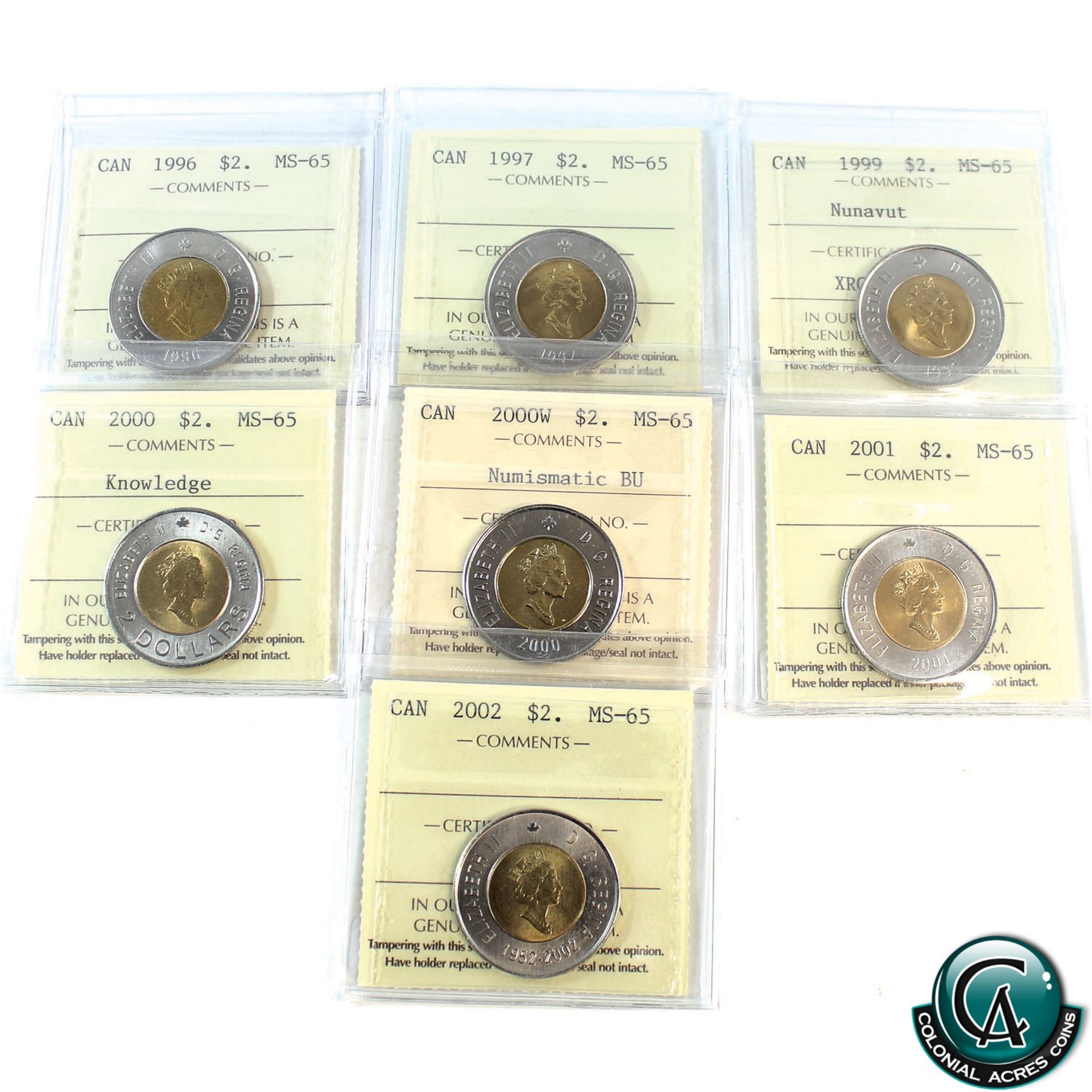$2 1996, 1997, 1999 Nunavut, 2000 Knowledge, 2000W NBU, 2001, & 2002 ICCS Certified MS-65. 7pcs.