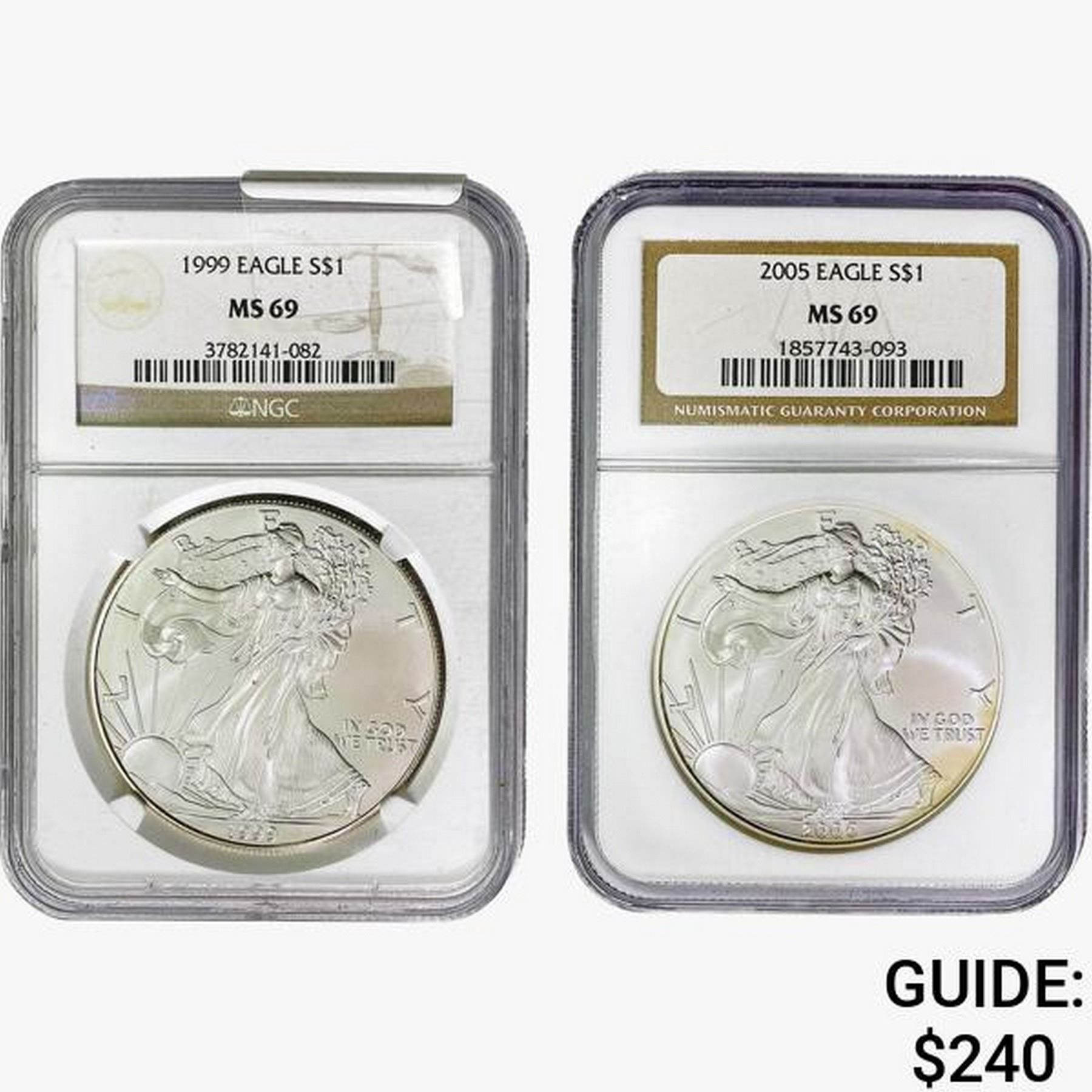 [2] 1999 & 2005 Silver Eagle NGC MS69