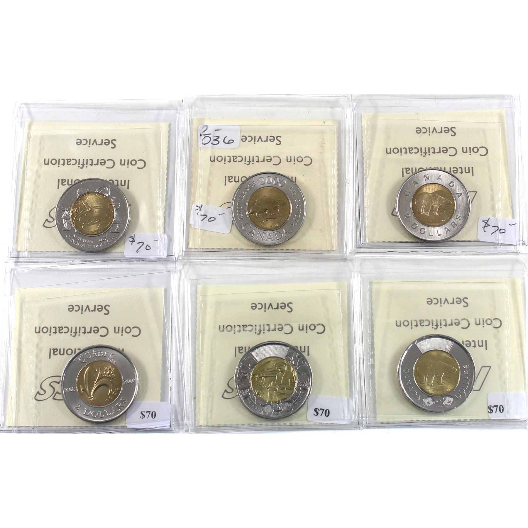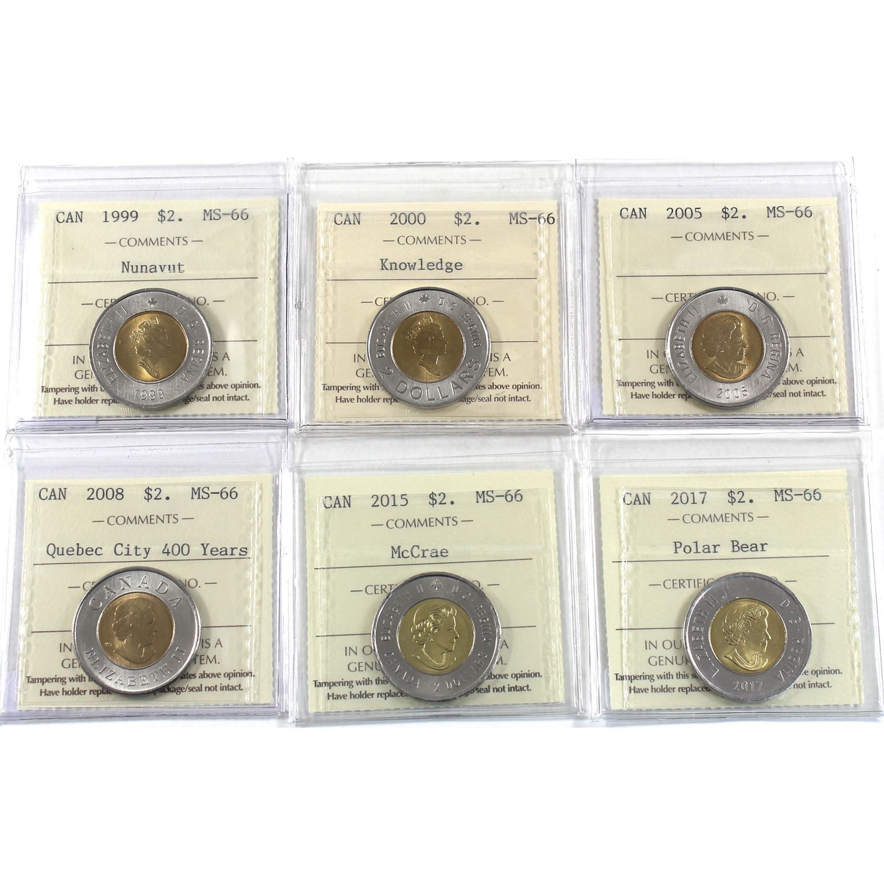$2 1999 Nunavut, 2000 Knowledge, 2005, 2008 Quebec City, 2015 McCrae, & 2017 Polar Bear ICCS Certified MS-66. 6Pcs.