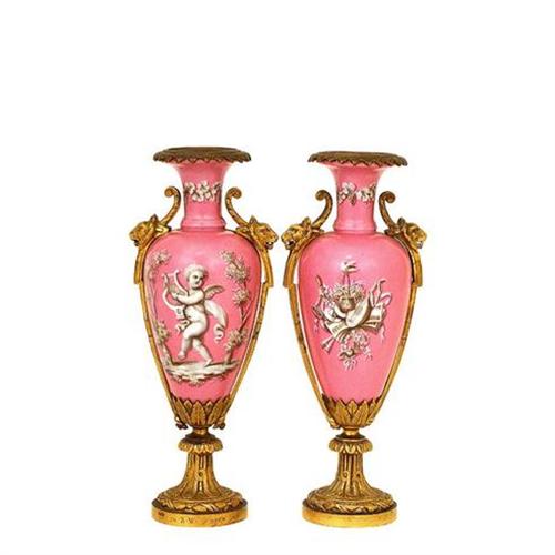 Pair of 19th Century Gilded Bronze Mounted Sevres Meissen Style Churb Vases Mark 1873