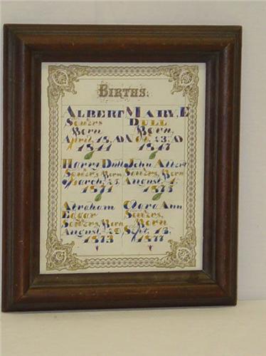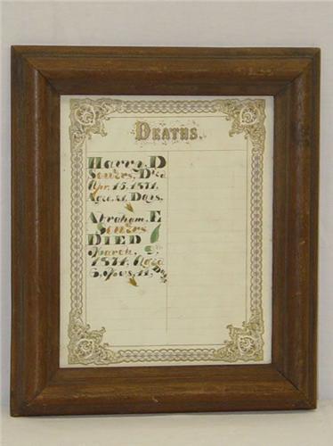 (2) 19TH CENT. FRAMED FAMILY RECORDS ON PAPER: DEATHS & BIRTHS - PRE-PRINTED FORMS W/ WATERCOLOR ENTRIES- SOWERS FAMILY 1841-1877
