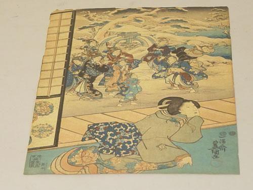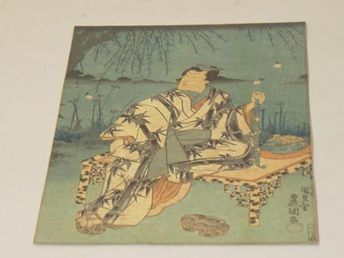 (2) 19TH CENT. JAPANESE WOODBLOCK PRINTS: (1) WOMAN W/ WINTER SCENE SCREEN & (1) MAN W/ PIPE & FIREFLIES- ARTIST UNKNOWN (AVG. SIZE-14" X 9 1/2") - WEAR, TONING, STAINS & IMPERFECTIONS