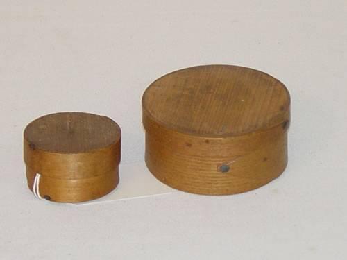 (2) 19TH CENT. SMALL ROUND FINGERED PANTRY BOXES IN NATURAL FINISH: (1) 2 1/8" ROUND, & (1) 3 3/8" ROUND - IMPERFECTIONS;