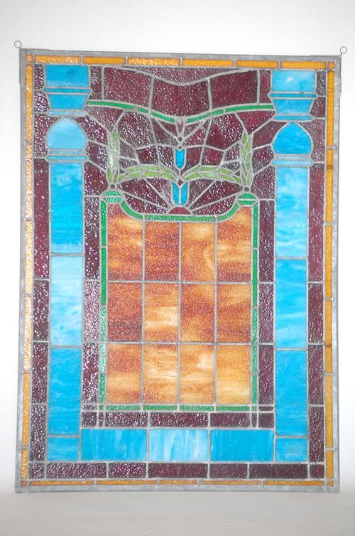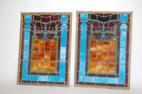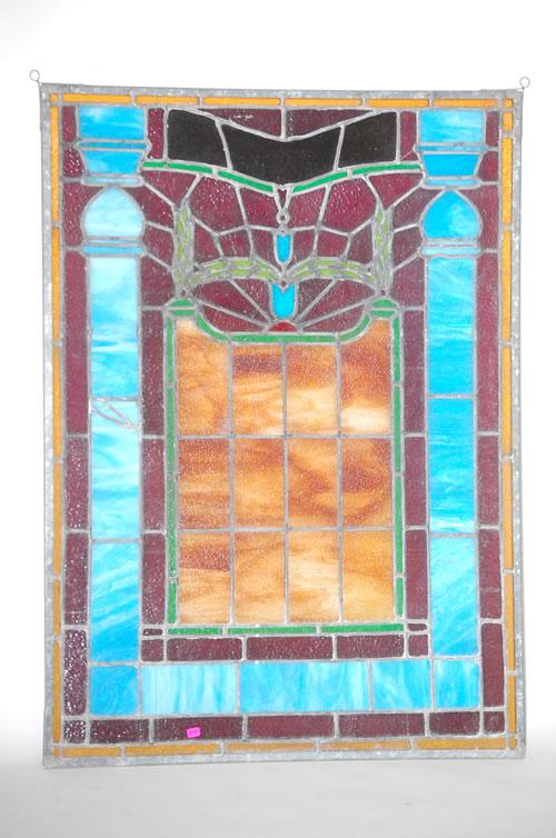 (2) 19TH CENT. STAINED GLASS WINDOWS - (2) 19TH CENT. COLORED LEADED GLASS WINDOWS W/ ARCHITECTURAL SPIRES & A WREATH W/ BELLFLOWERS-UNFRAMED (39" X 29") - WEAR, SMALL BREAKS, IMPERFECTIONS