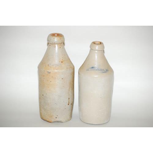 (2) 19TH CENT. STONEWARE BOTTLES - (2) GREY STONEWARE BOTTLES W/ NAMES: (1) 9 1/4" R. ROBINSON 18 W/ COBALT HIGHLIGHTED LETTERS & (1) 10" B. MCCLOY (BASE RIM CHIP) - WEAR & IMPERFECTIONS
