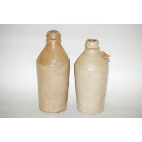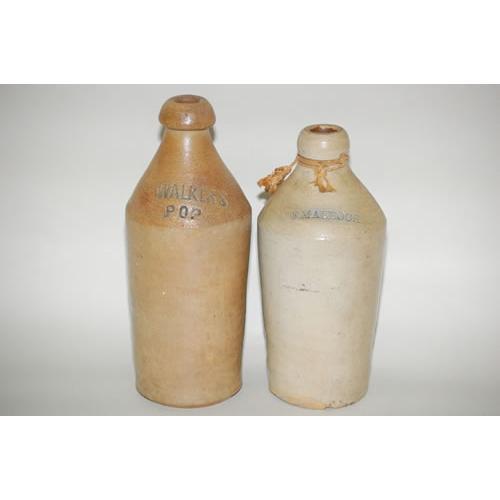 (2) 19TH CENT. STONEWARE BOTTLES - (2) GREY STONEWARE BOTTLES W/ NAMES & COBALT HIGHLIGHTED LETTERS: (1) 9 1/4" F. MALLOCH (SMALL BASE RIM CHIPS) & (1) 10 1/4" WALKER'S POP - WEAR & IMPERFECTIONS