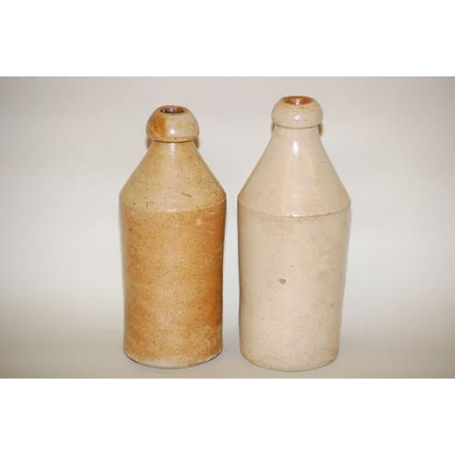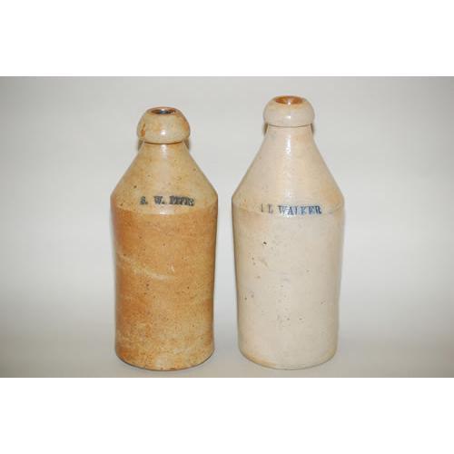 (2) 19TH CENT. STONEWARE BOTTLES - (2) GREY STONEWARE BOTTLES W/ NAMES & COBALT HIGHLIGHTED LETTERS: (1) 9 1/2" S.W. PITTS & (1) 10" A.L. WALKER (RIM CHIPS) - WEAR & IMPERFECTIONS
