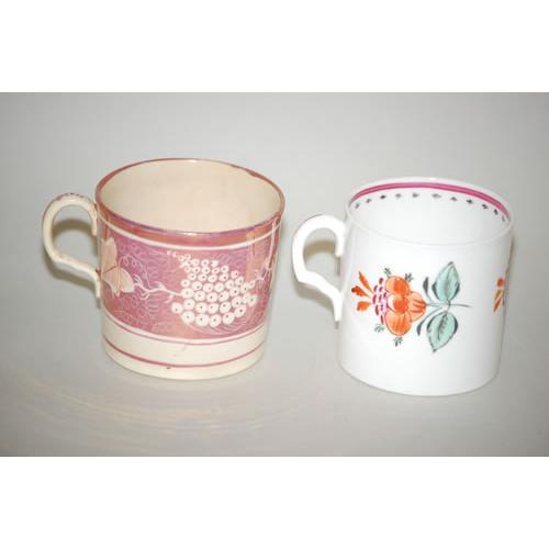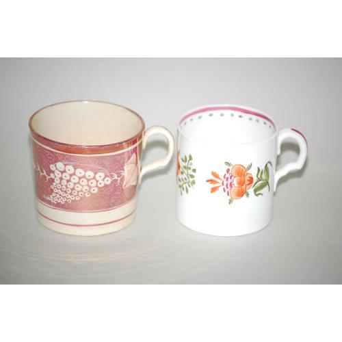 (2) 2 1/2" HANDLED CHILDS MUGS - (1) EARLY 19TH CENT. HARD PASTE MUG W/ FLORAL SPRIG DECORATIONS & (1) PINK LUSTRE SOFT PASTE MUG W/ VINTAGE DECORATIONS - LUSTRE MUG W/ STAIN & GLAZE CRAZING, BOTH W/ WEAR & IMPERFECTIONS