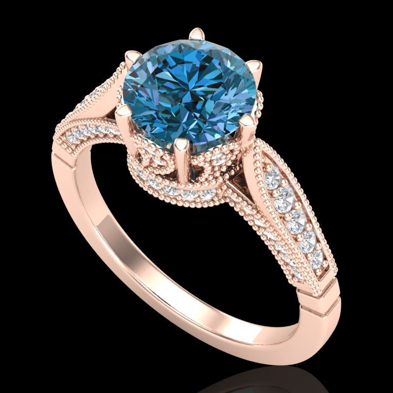 2.2 CTW Intense Blue Diamond Solitaire Engagement Art Deco Ring 18K Rose Gold ---- Luxury Designer Brand Ring Appraised Retail Price at $20,750 ---- SKU Number US38091 18k Rose gold Ring Size is 7, Ring measuring approx. Uniform, weighing in total approx. 6 grams. Made in the USA and is stamped 18k, Main stone 1.55 carat total weight containing 1 pieces of Intense Fancy Blue color with SI quality Round shape cut Diamond , Stone #2 0.65 carat total weight containing 57 pieces of H-I color with VS/SI quality Round shape cut