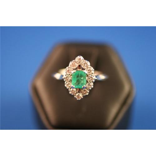 This ring absolutely dances in the light! 1.2 carats of clean (estimated to be VS/color F) diamonds surround a kelly green one carat emerald-all set in Platinum. A very special ring! It weighs 3.7 grams and is a size 7.5 (sizable by me or by your jeweler).