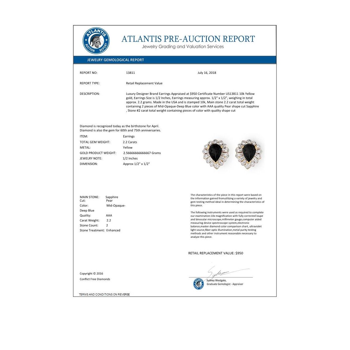 REF-15Y6K -13811 ---- 2.20 CTW Blue Sapphire Earrings 10K Yellow Gold ---- Luxury Designer Brand Earrings Appraised at $950 Certificate Number US13811 10k Yellow gold, Earrings Size is 1/2 Inches, Earrings measuring approx. 1/2" x 1/2", weighing in total approx. 2.2 grams. Made in the USA and is stamped 10k, Main stone 2.2 carat total weight containing 2 pieces of Mid-Opaque-Deep Blue color with AAA quality Pear shape cut Sapphire , Stone #2 carat total weight containing pieces of color with quality shape cut