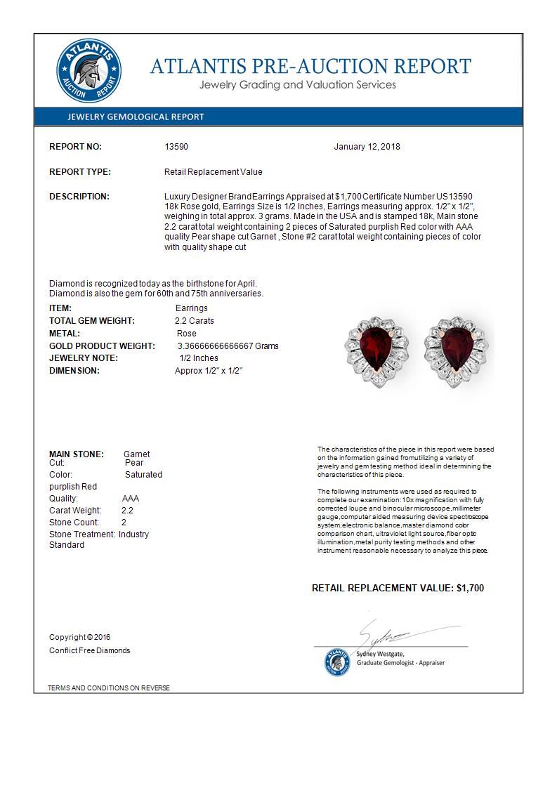 REF-28M2H -13590 ---- 2.20 CTW Garnet Earrings 18K Rose Gold ---- Luxury Designer Brand Earrings Appraised at $1,700 Certificate Number US13590 18k Rose gold, Earrings Size is 1/2 Inches, Earrings measuring approx. 1/2" x 1/2", weighing in total approx. 3 grams. Made in the USA and is stamped 18k, Main stone 2.2 carat total weight containing 2 pieces of Saturated purplish Red color with AAA quality Pear shape cut Garnet , Stone #2 carat total weight containing pieces of color with quality shape cut