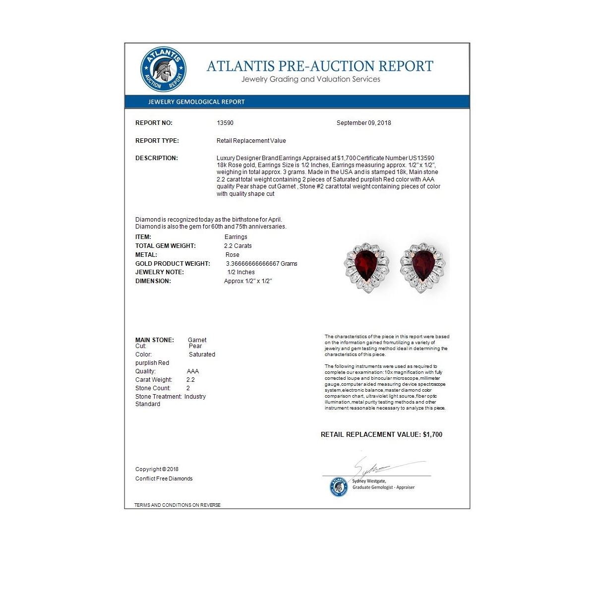 REF-28M2H -13590 ---- 2.20 CTW Garnet Earrings 18K Rose Gold ---- Luxury Designer Brand Earrings Appraised at $1,700 Certificate Number US13590 18k Rose gold, Earrings Size is 1/2 Inches, Earrings measuring approx. 1/2" x 1/2", weighing in total approx. 3 grams. Made in the USA and is stamped 18k, Main stone 2.2 carat total weight containing 2 pieces of Saturated purplish Red color with AAA quality Pear shape cut Garnet , Stone #2 carat total weight containing pieces of color with quality shape cut