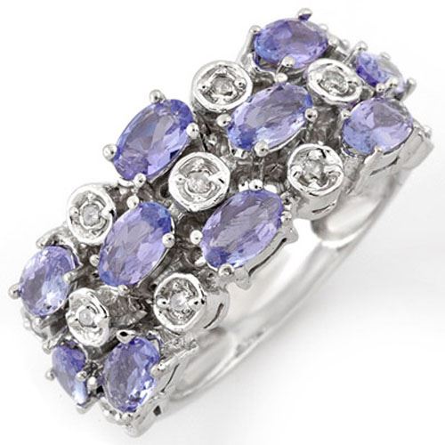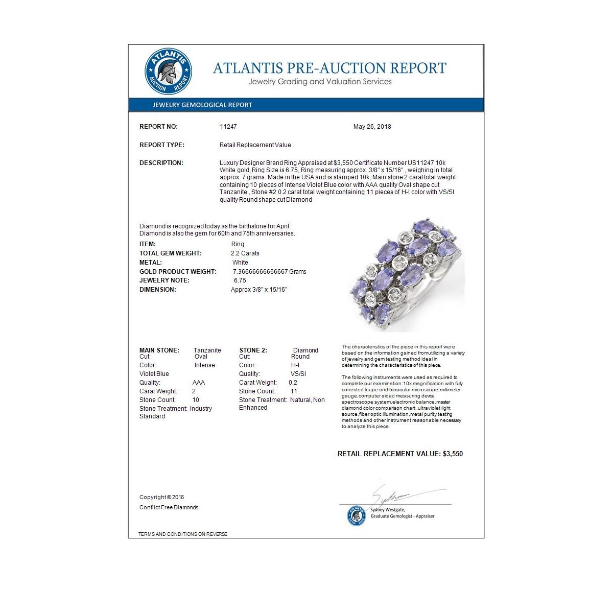 REF-49T8M -11247 ---- 2.20 CTW Tanzanite & Diamond Ring 10K White Gold ---- Luxury Designer Brand Ring Appraised at $3,550 Certificate Number US11247  10k White gold,  Ring Size is 6.75, Ring measuring approx. 3/8" x  15/16" , weighing in total approx. 7 grams. Made in the USA and is stamped 10k, Main stone 2 carat total weight containing 10 pieces of Intense Violet Blue color with AAA quality Oval shape cut Tanzanite , Stone #2 0.2 carat total weight containing 11 pieces of H-I color with  VS/SI quality Round shape cut Diamond