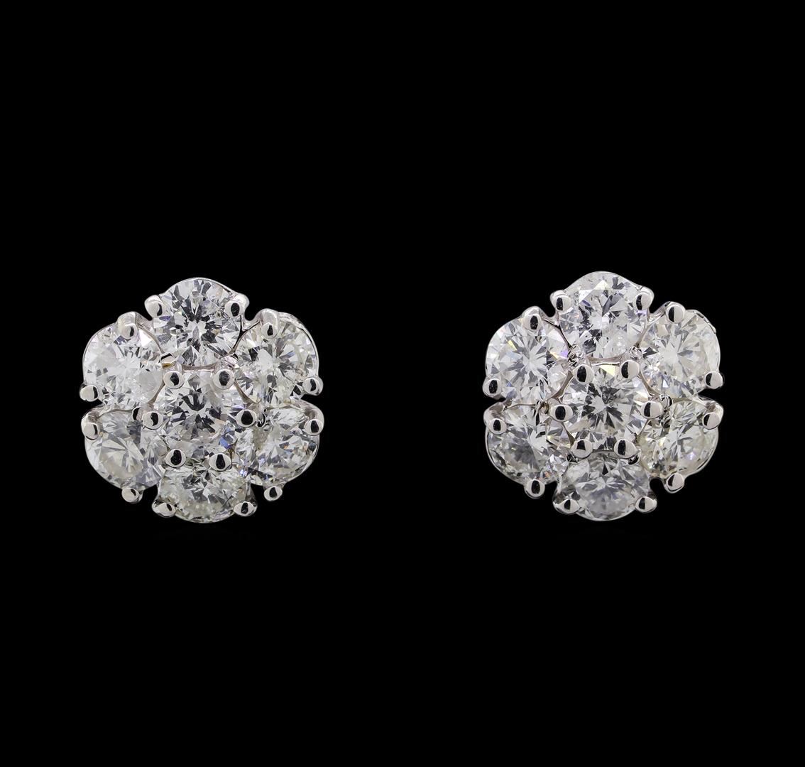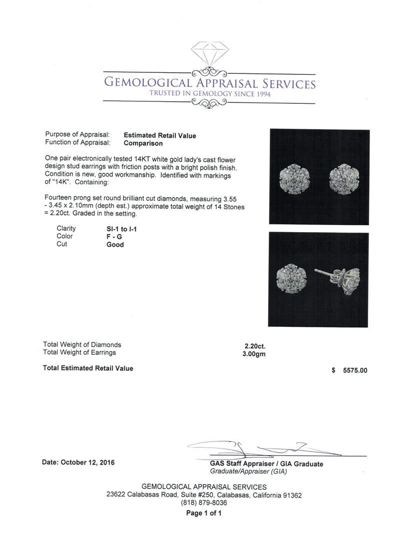 One pair electronically tested 14KT white gold lady's cast flower design stud earrings with friction posts with a bright polish finish. Identified with markings of '14K'. Condition is new, good workmanship. Containing: Fourteen prong set round brilliant cut diamonds, measuring 3.55 - 3.45 x 2.10mm (depth est.) approximate total weight of 14 Stones = 2.20ct. Graded in the setting. Clarity SI-1 to I-1. Color: F - G Cut Good. Total Weight of Diamonds 2.20ct.. Total Weight of Earrings 3.00gm. GAS Appraised at $5,575.00.