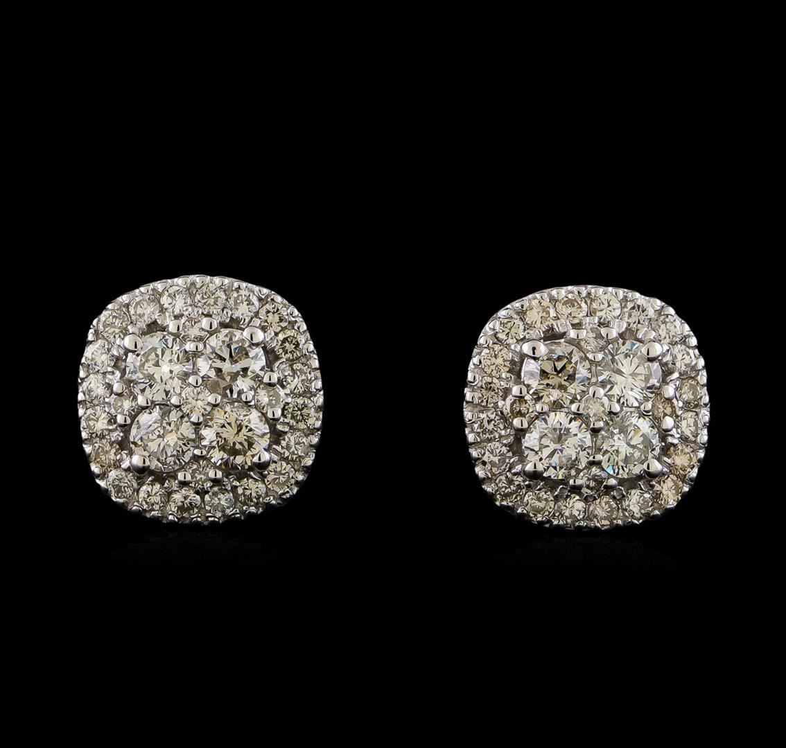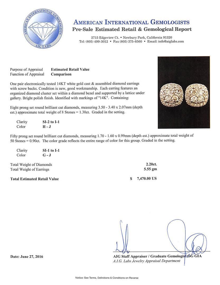 One pair electronically tested 14KT white gold cast & assembled diamond earrings with screw backs. Each earring features an organized diamond cluster set within a diamond bezel and supported by a lattice under gallery. Bright polish finish. Identified with markings of "14K". Condition is new, good workmanship. Containing: Eight prong set round brilliant cut diamonds, measuring 3.50 - 3.40 x 2.07mm (depth est.) approximate total weight of 8 Stones = 1.30ct. Graded in the setting. Clarity: SI-2 to I-1. Color: H - J Fifty prong set round brilliant cut diamonds, measuring 1.70 - 1.60 x 0.99mm (depth est.) approximate total weight of 50 Stones = 0.90ct. The color grade reflects the entire range of color for this group. Graded in the setting. Clarity: SI-1 to I-1. Color: G - J. Total Weight of Diamonds 2.20ct. Total Weight of Earrings 5.55gm. AIG Appraised at $7,470.00.
