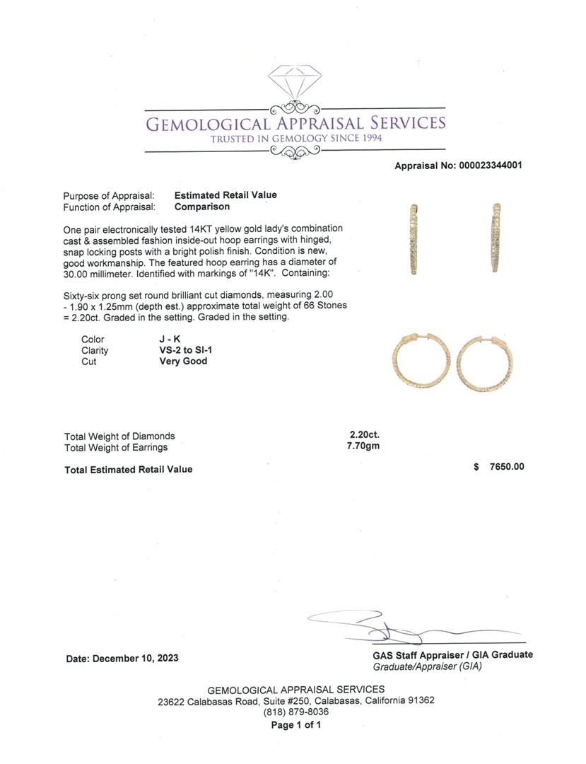 One pair electronically tested 14KT yellow gold lady's combination cast & assembled fashion inside-out hoop earrings with hinged, snap locking posts with a bright polish finish. The featured hoop earring has a diameter of 30.00 millimeter. Identified with markings of "14K". Condition is new, good workmanship. Containing: Sixty-Six prong set round brilliant cut diamonds, measuring 2.00 - 1.90 x 1.25mm (depth est.) approximate total weight of 66 Stones = 2.20ct. Graded in the setting. Graded in the setting. Color J - K Clarity VS-2 to SI-1 Cut Very Good Total Weight of Diamonds 2.20ct. Total Weight of Earrings 7.70gm Estimated Retail Value $ 7650.00